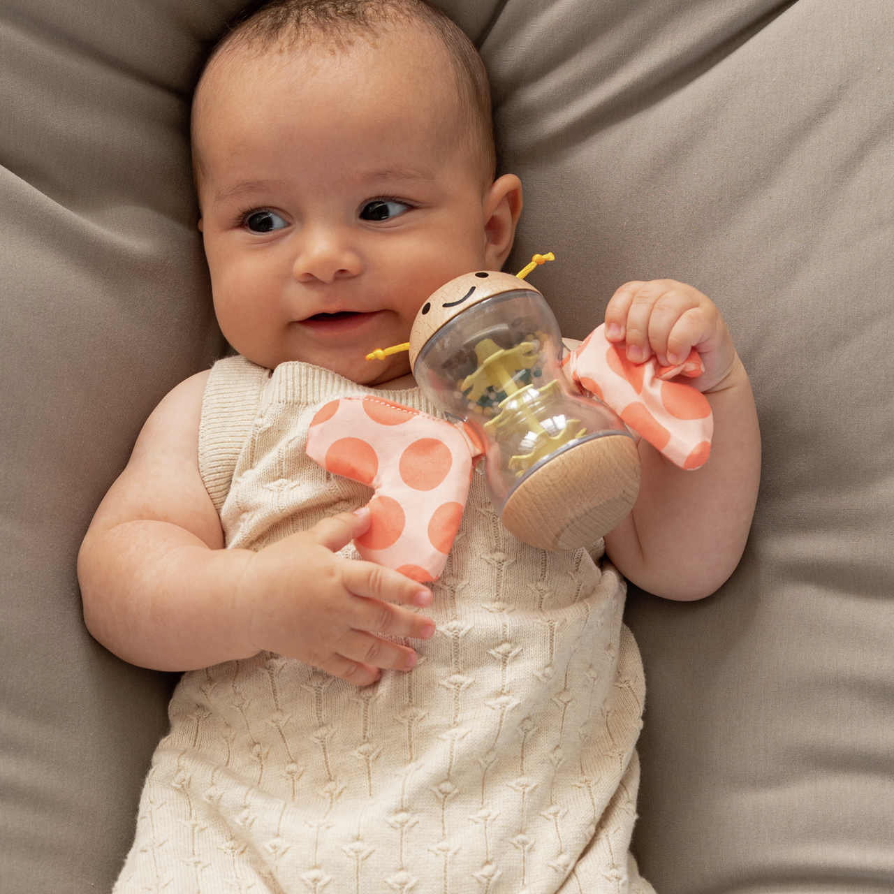 - BABY-SAFE CONSTRUCTION: The rattle’s smooth wooden construction and sturdy plastic body ensure that it’s safe for little hands to hold and curious mouths to teethe.
