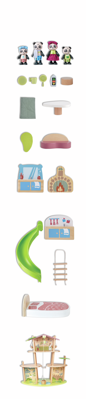 - PLENTY OF ACCESSORIES: This playset comes with a house, four panda figurines, two hammocks, one bed, one dressing table, one sofa, one tea table, two floor mats, one sun umbrella, one table with two stump seats, one fireplace, one stove, two plates, two cups, one pan, one elevator basket on a string, one suspension bridge, one slide and one rope ladder.