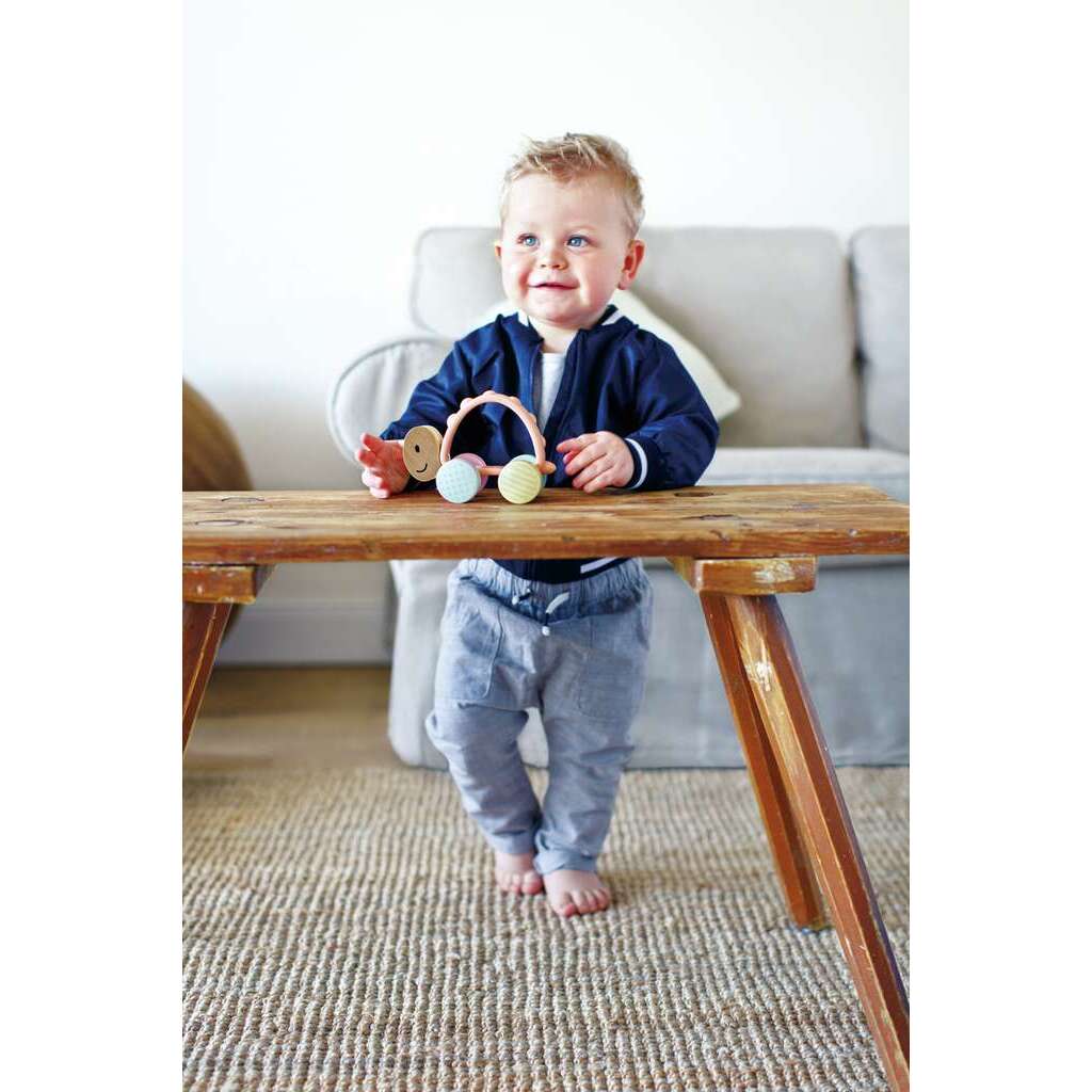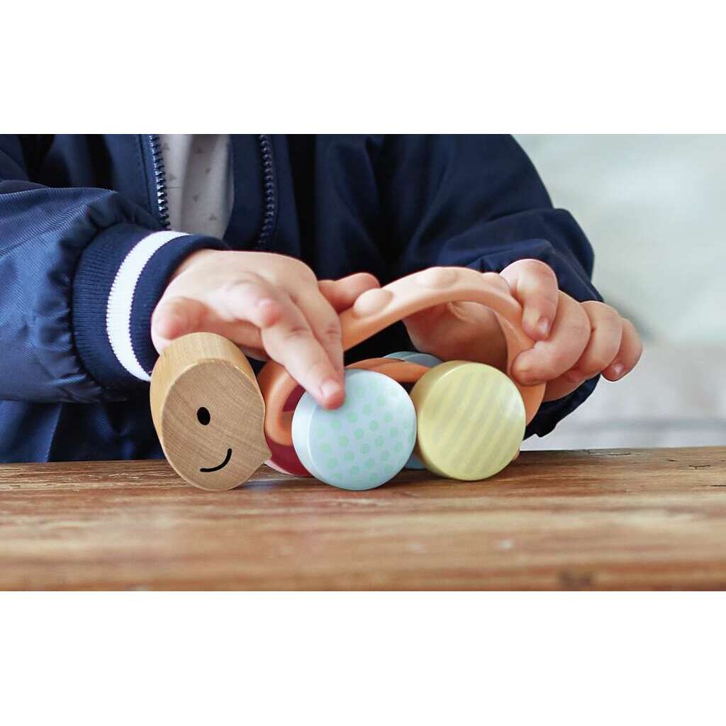 The Turbo Turtle is not only a cute rolling toy, but with its natural rubber body is also suitable as a teething ring. The head and wheels are made of wood, with each wheel featuring a different colourful pattern. This turtle rolls along thanks to its movable, textured body, which is easy for little hands to grasp.